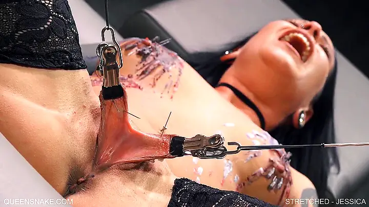 Растянули пизду зажимами, залили горячим воском и БДСМ соло видео сняли